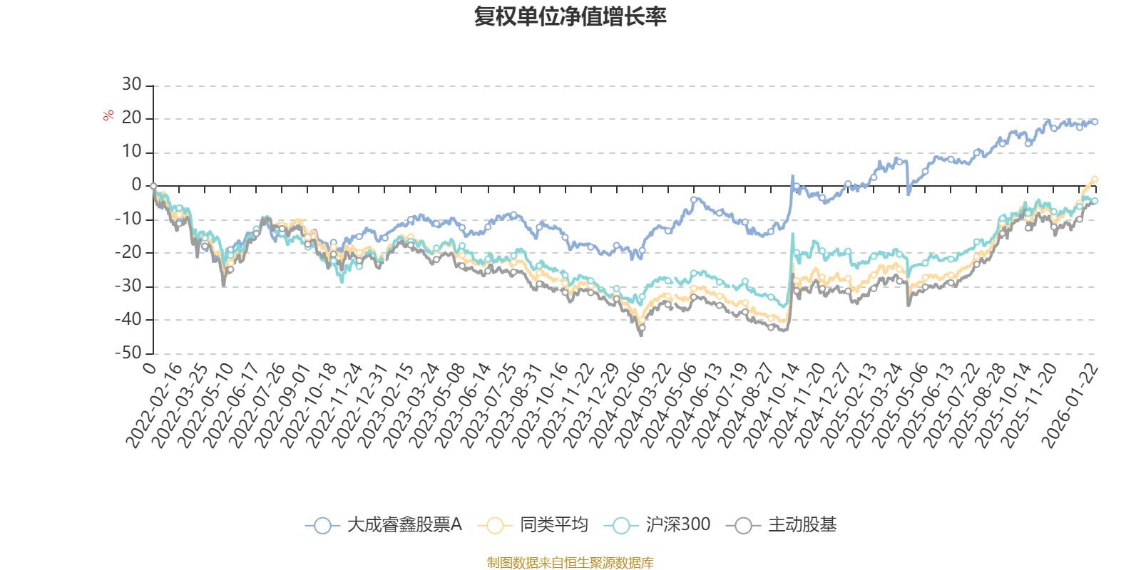截至1月22日,大成睿鑫股票A近三个月复权单位净值增长率为5.06%,位于同类可比基金130/167;近半年复权单位净值增长率为8.42%,位于同类可比基金148/167;近一年复权单位净值增长率为19.30%,位于同类可比基金148/165;近三年复权单位净值增长率为34.39%,位于同类可比基金44/156。