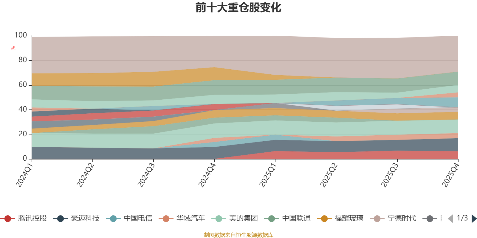 该基金持股集中度较高,近2年前十大重仓股集中度长期超过60%。截至2025年四季度末,基金十大重仓股分别是美的集团、中国移动、豪迈科技、海尔智家、腾讯控股、福耀玻璃、中国海洋石油、华域汽车、浙江龙盛、宁德时代。