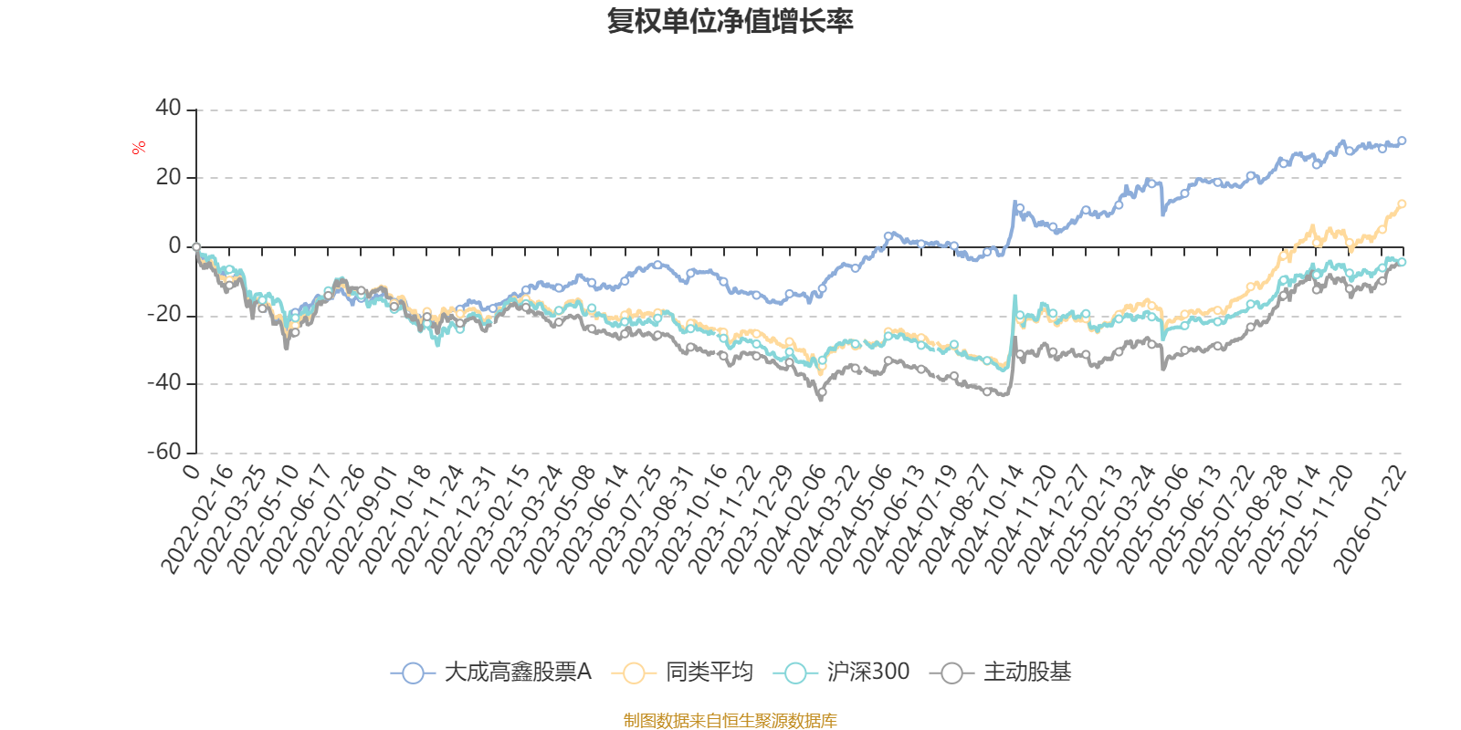 截至1月22日,大成高鑫股票A近三个月复权单位净值增长率为5.22%,位于同类可比基金42/58;近半年复权单位净值增长率为8.47%,位于同类可比基金52/58;近一年复权单位净值增长率为19.84%,位于同类可比基金52/57;近三年复权单位净值增长率为52.54%,位于同类可比基金11/57。