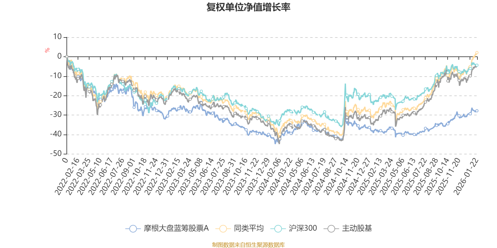 截至1月22日,摩根大盘蓝筹股票A近三个月复权单位净值增长率为7.82%,位于同类可比基金112/167;近半年复权单位净值增长率为14.27%,位于同类可比基金132/167;近一年复权单位净值增长率为16.73%,位于同类可比基金152/165;近三年复权单位净值增长率为-1.98%,位于同类可比基金128/156。