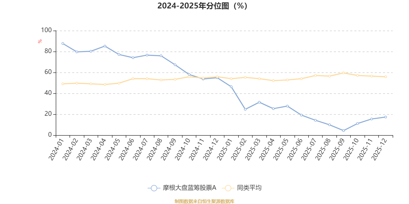 通过所选区间该基金净值增长率分位图,可以观察该基金与同类基金业绩比较情况。图为坐标原点到区间内某时点的净值增长率在同类基金中的分位数。