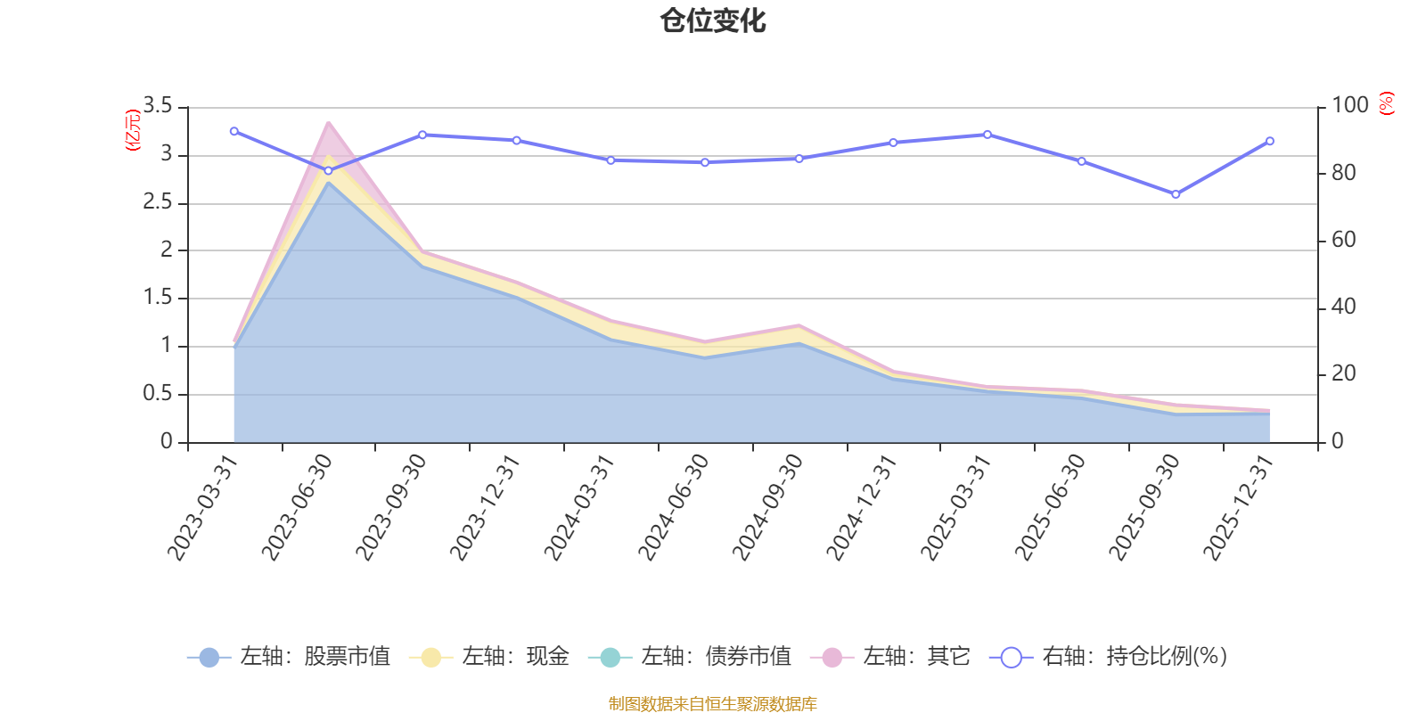 据定期报告数据统计,近三年平均股票仓位为86.37%,同类平均为88.34%。2023年一季度末基金达到92.77%的最高仓位,2025年三季度末最低,为73.99%。