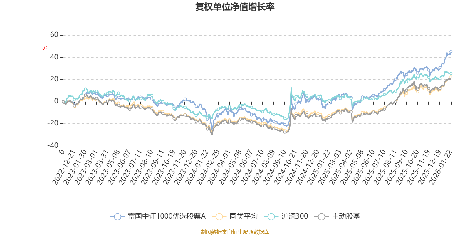 截至1月22日,富国中证1000优选股票A近三个月复权单位净值增长率为14.34%,位于同类可比基金35/121;近半年复权单位净值增长率为26.30%,位于同类可比基金57/121;近一年复权单位净值增长率为48.19%,位于同类可比基金41/119;近三年复权单位净值增长率为38.62%,位于同类可比基金18/89。