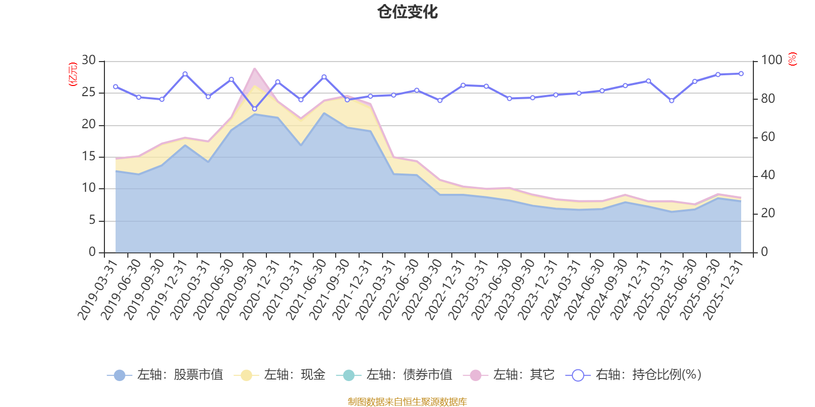 据定期报告数据统计,近三年平均股票仓位为85.84%,同类平均为88.27%。2025年末基金达到93.46%的最高仓位,2020年三季度末最低,为75.02%。