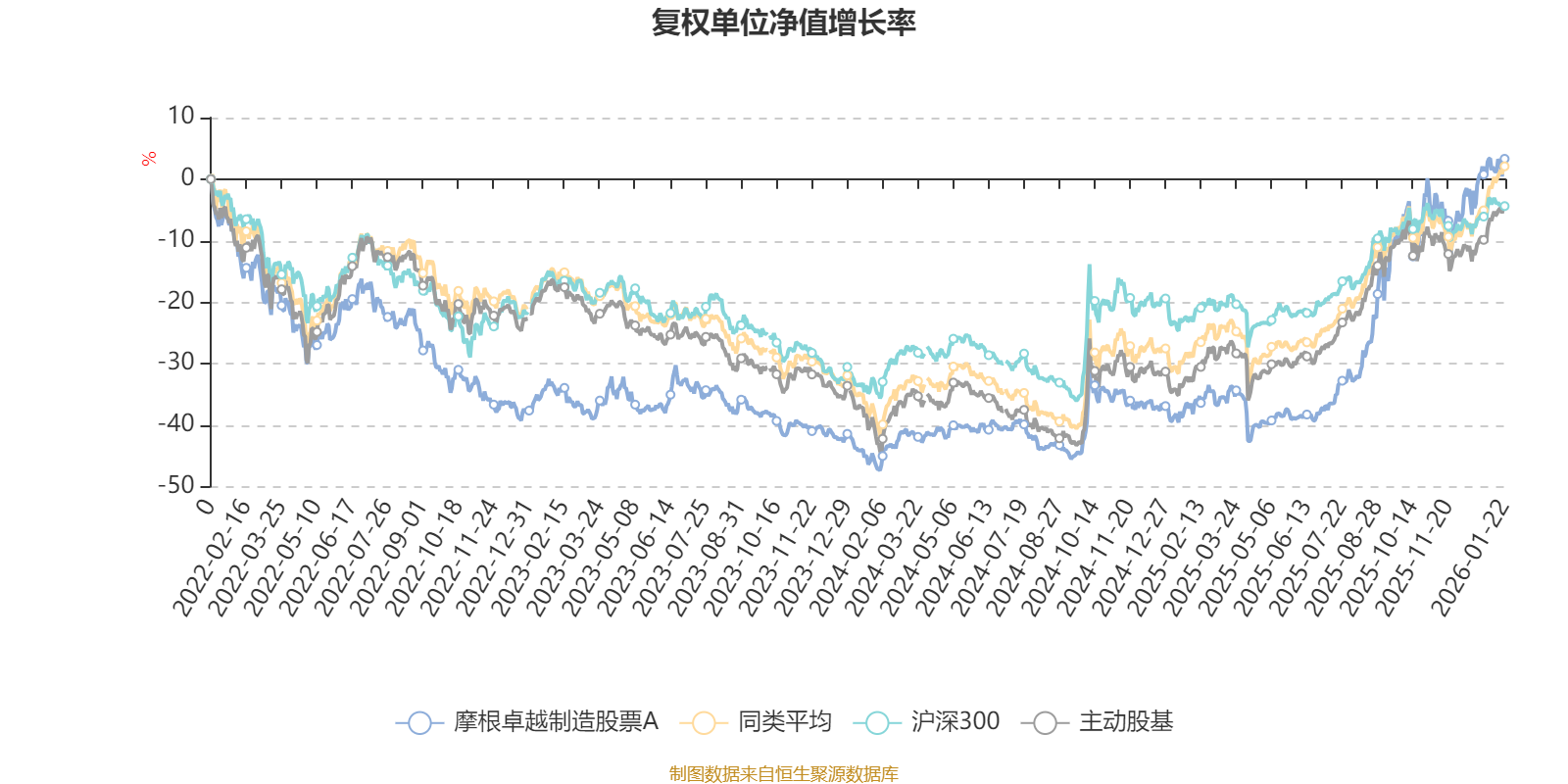 截至1月22日,摩根卓越制造股票A近三个月复权单位净值增长率为13.43%,位于同类可比基金56/167;近半年复权单位净值增长率为53.69%,位于同类可比基金9/167;近一年复权单位净值增长率为62.87%,位于同类可比基金15/165;近三年复权单位净值增长率为55.38%,位于同类可比基金15/156。