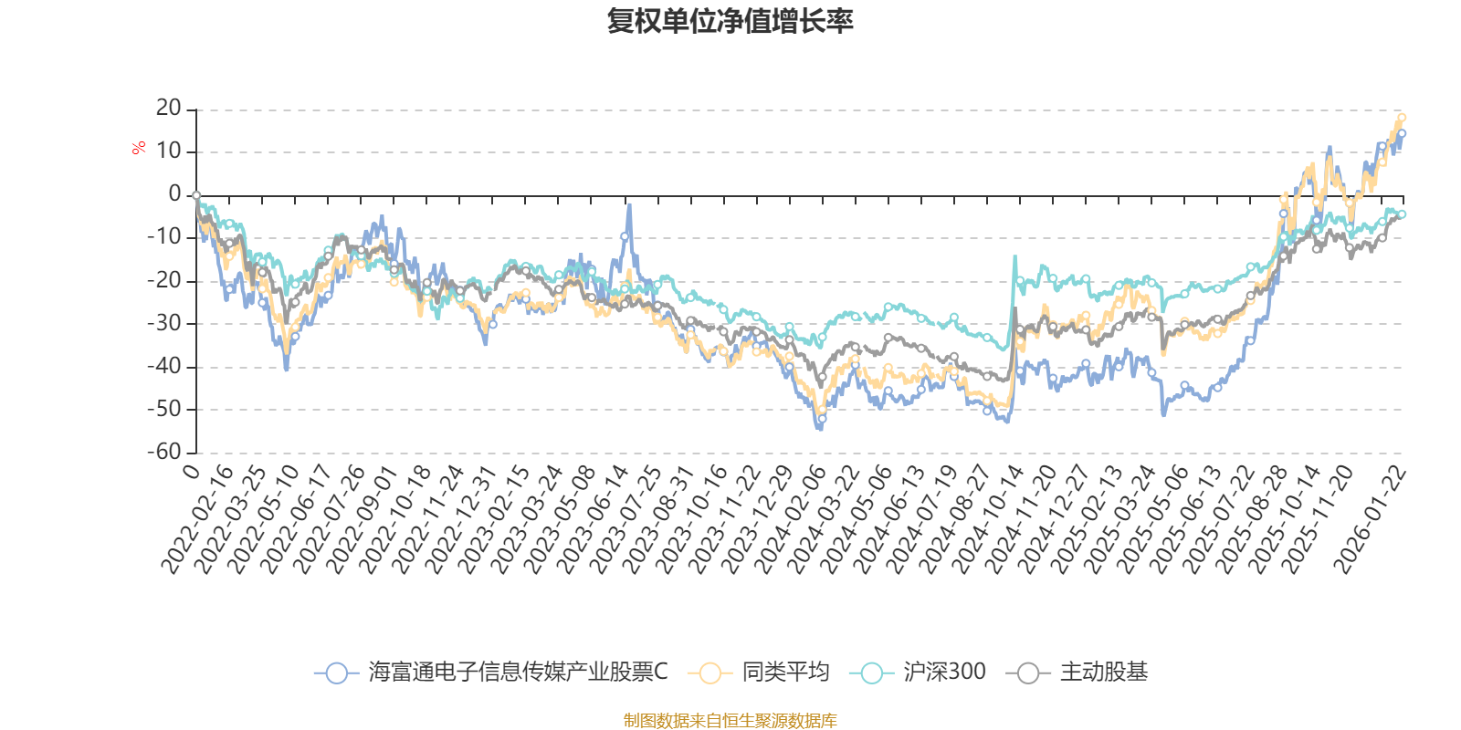 截至1月22日,海富通电子信息传媒产业股票C近三个月复权单位净值增长率为13.65%,位于同类可比基金39/63;近半年复权单位净值增长率为72.95%,位于同类可比基金14/63;近一年复权单位净值增长率为82.21%,位于同类可比基金14/62;近三年复权单位净值增长率为48.59%,位于同类可比基金33/52。