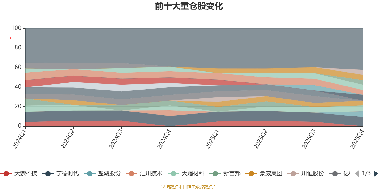 该基金持股集中度较高,且持股标的较为稳定。截至2025年四季度末,基金十大重仓股分别是宁德时代、盐湖股份、雅化集团、天赐材料、华友钴业、湖南裕能、天齐锂业、璞泰来、豪威集团、赣锋锂业。