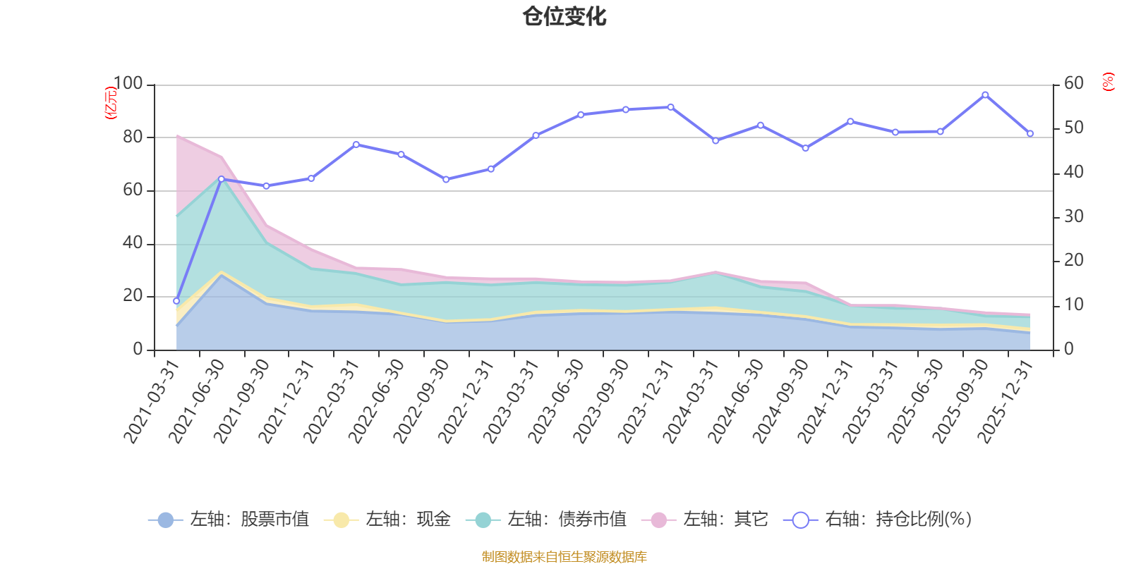 据定期报告数据统计,近三年平均股票仓位为50.98%,同类平均为67.52%。2025年三季度末基金达到57.69%的最高仓位,2021年一季度末最低,为11.1%。
