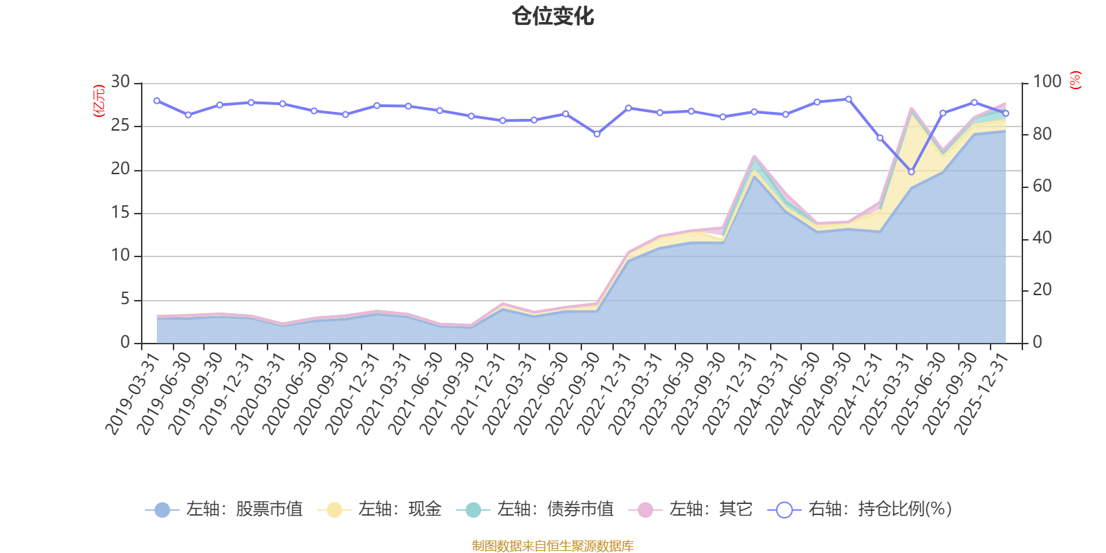 据定期报告数据统计,近三年平均股票仓位为86.84%,同类平均为88.64%。2024年三季度末基金达到93.79%的最高仓位,2025年一季度末最低,为65.84%。