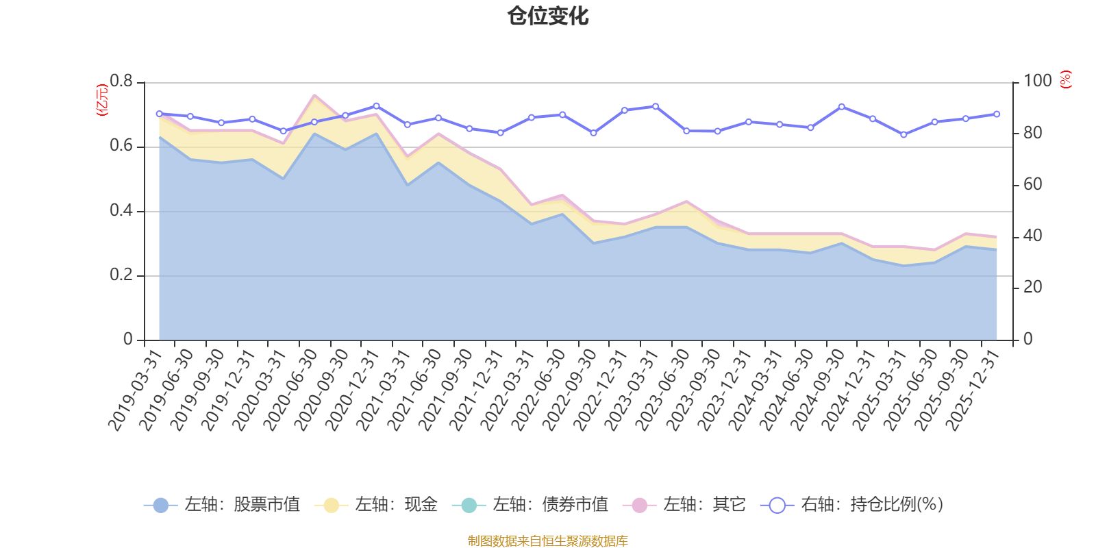 据定期报告数据统计,近三年平均股票仓位为84.79%,同类平均为88.34%。2020年末基金达到90.78%的最高仓位,2025年一季度末最低,为79.68%。