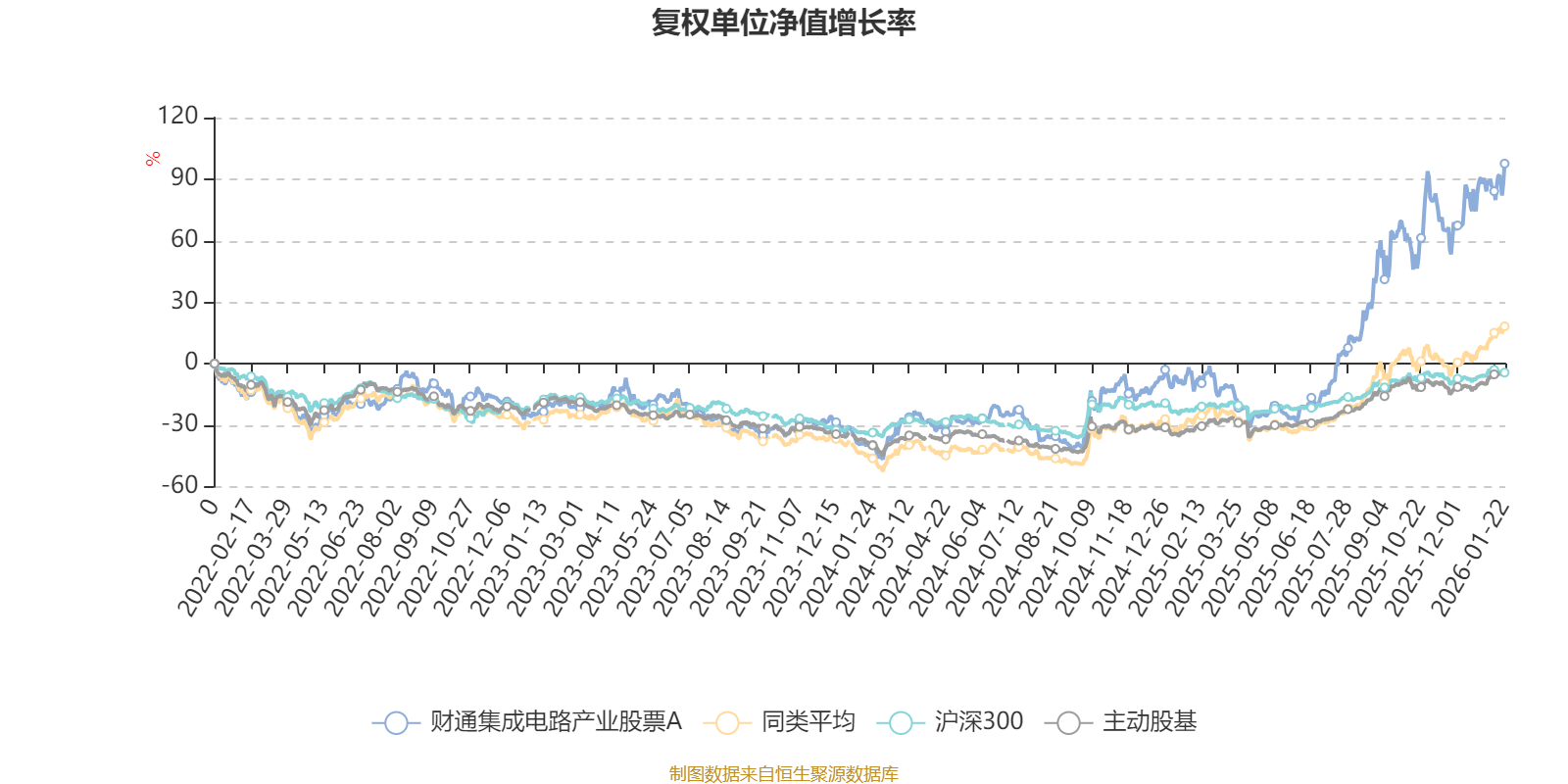 截至1月22日,财通集成电路产业股票A近三个月复权单位净值增长率为22.48%,位于同类可比基金14/63;近半年复权单位净值增长率为86.94%,位于同类可比基金3/63;近一年复权单位净值增长率为101.38%,位于同类可比基金4/62;近三年复权单位净值增长率为145.38%,位于同类可比基金1/52。