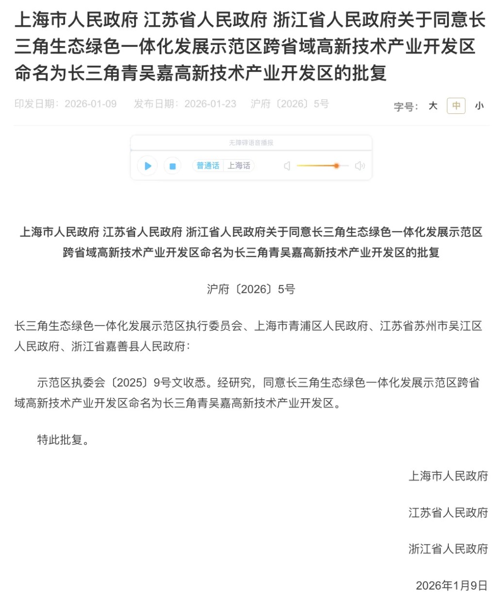 据上海市政府网站1月23日消息,近日,上海市人民政府、江苏省人民政府、浙江省人民政府发布《关于同意长三角生态绿色一体化发展示范区跨省域高新技术产业开发区命名为长三角青吴嘉高新技术产业开发区的批复》。