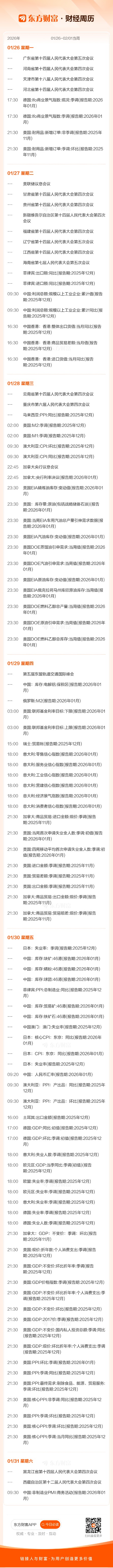 东方财富财经周历(1.26-2.1)