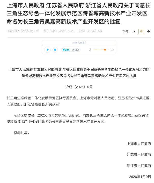1月23日,上海市政府网站发布一则批复,上海市人民政府、江苏省人民政府、浙江省人民政府同意“长三角生态绿色一体化发展示范区跨省域高新技术产业开发区”命名为“长三角青吴嘉高新技术产业开发区”。