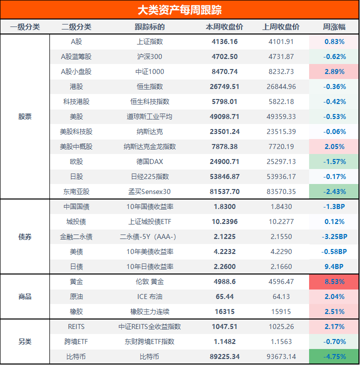 美股本周高位震荡,道琼斯指数下跌0.53%,纳斯达克指数回调0.06%,德国DAX指数下跌1.57%;黄金暴涨超8%,历史首次逼近5000美元;原油上涨2.04%,比特币跌近5%。