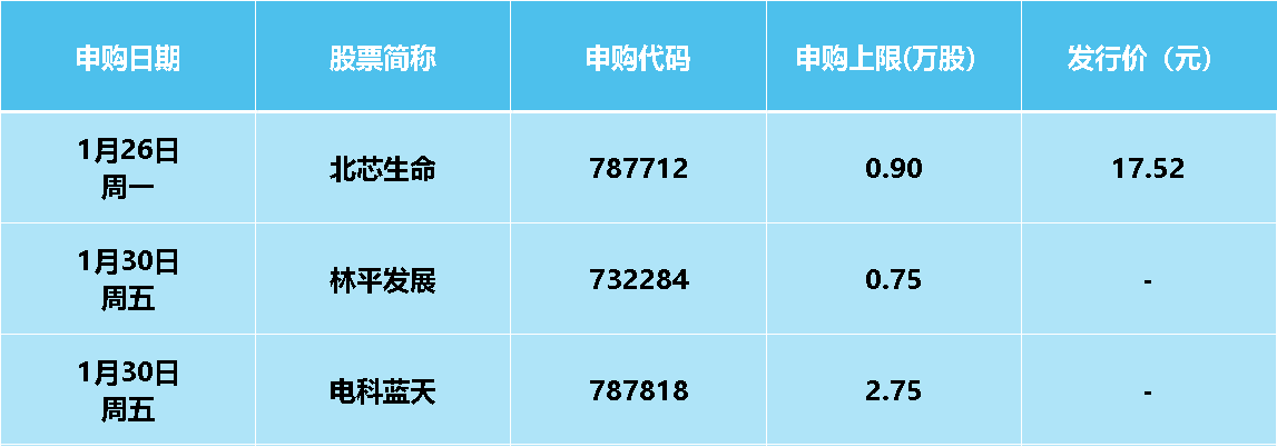 本周(1月26日至2月1日),沪深两市共有3只新股申购。其中科创板2只、沪市主板1只。