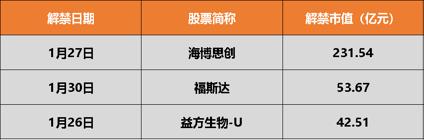 具体来看,海博思创在1月27日将解禁9464万股,为首发原股东限售股份、首发战略配售股份。福斯达在1月30日将解禁1.10亿股,益方生物-U在1月26日将解禁1.61亿股,均为首发原股东限售股份。