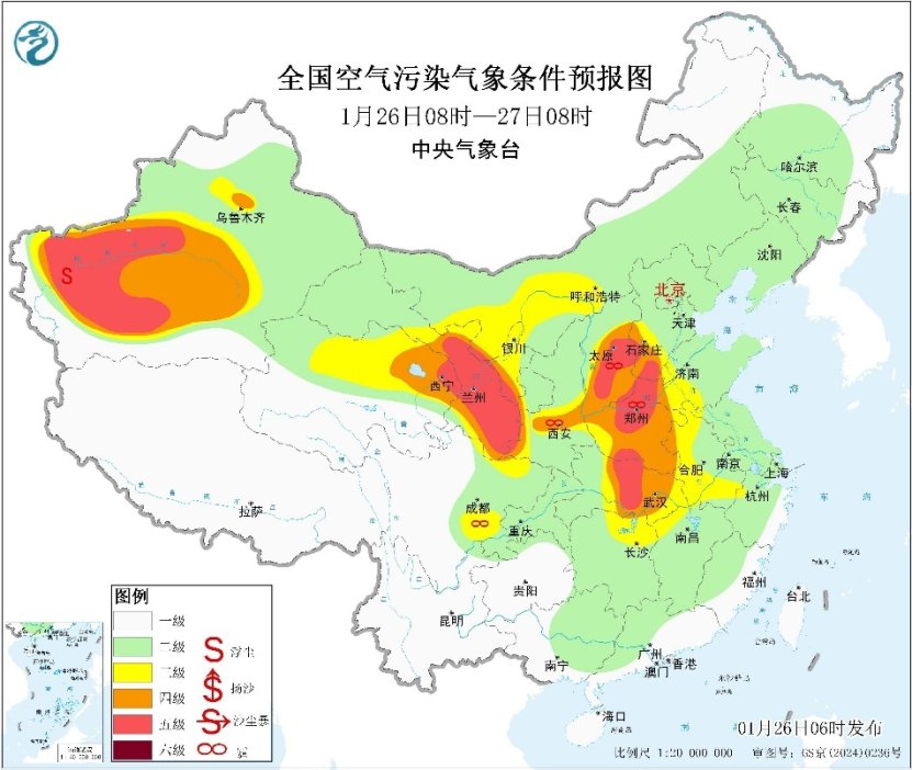 中央气象台1月26日消息,昨日,北方多地再次受到弱冷空气影响,其中陕西、山西等地出现小雪或雨夹雪;内蒙古中西部、宁夏及青海等地出现6~8级、局地9级以上阵风,上述部分地区及甘肃中东部、陕西北部和西部等地伴有扬沙或浮尘。今晨,内蒙古西部、陕西北部、宁夏、青海等地出现6~8降温,局地降幅达10以上。