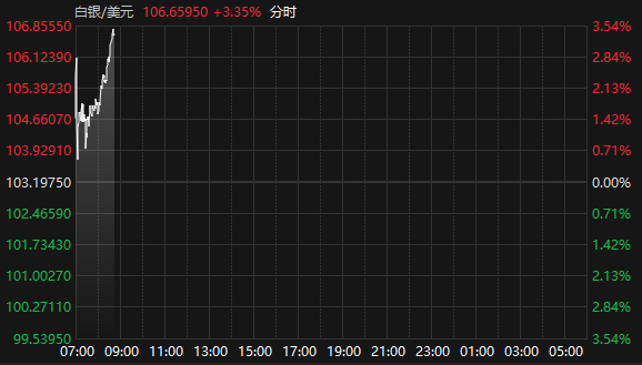 上证报中国证券网讯据Choice数据,1月26日,国际现货白银突破105美元/盎司关口,截至8:44报106.659美元/盎司,日内涨超3%。