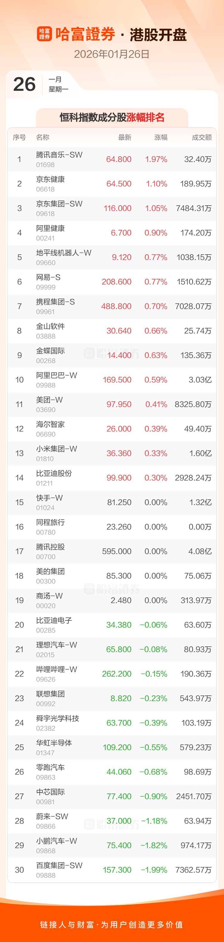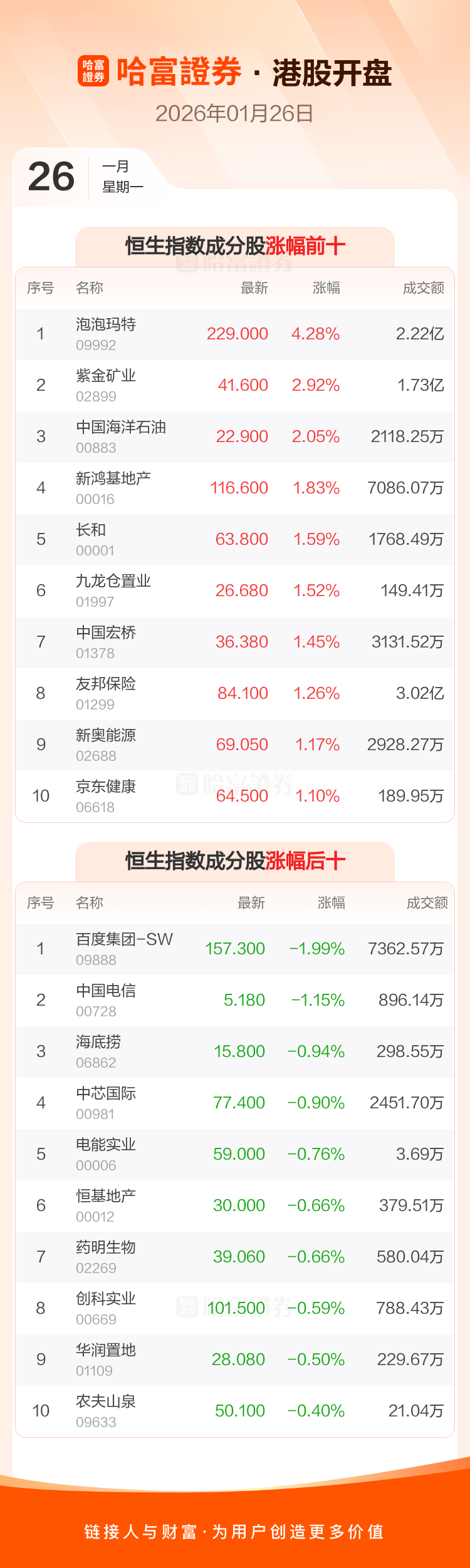 港股1月26日高开,恒生指数开盘报26844.04点,涨94.53点,涨幅0.35%;恒生科技指数开盘报5801.15点,涨3.14点,涨幅0.05%。恒生指数成分股中泡泡玛特、紫金矿业、中国海洋石油涨幅居前,百度集团-SW、中国电信、海底捞跌幅靠前。恒生科技指数成分股中腾讯音乐-SW、京东健康、京东集团-SW涨幅居前,百度集团-SW、小鹏汽车-W、蔚来-SW跌幅靠前。