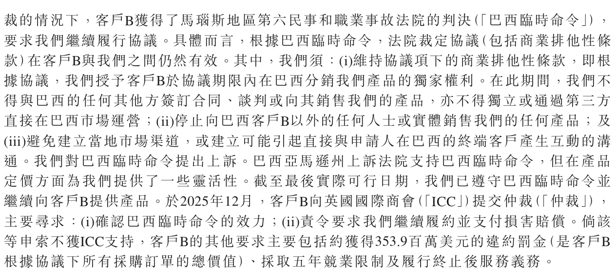 截至最新招股书披露,仲裁庭尚未正式组成,公司已上诉并在部分定价灵活性上获得法院支持。拉美地区此前收入占比曾超过20%,该纠纷的不确定性持续影响区域业务的正常恢复与增长路径。公司表示已聘请专业律师积极应对,但在审核过程中需详细说明潜在财务影响、和解预期以及临时禁令对经营的实际约束。