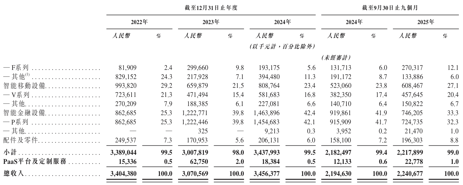 商米科技收入高度依赖智能设备销售,2022年至2024年该板块占比分别为99.5%、98%和99.5%,2025年前三季度仍保持在99%左右。而PaaS平台及定制服务等软件相关收入仅占约0.5%,2024年贡献1838万元。