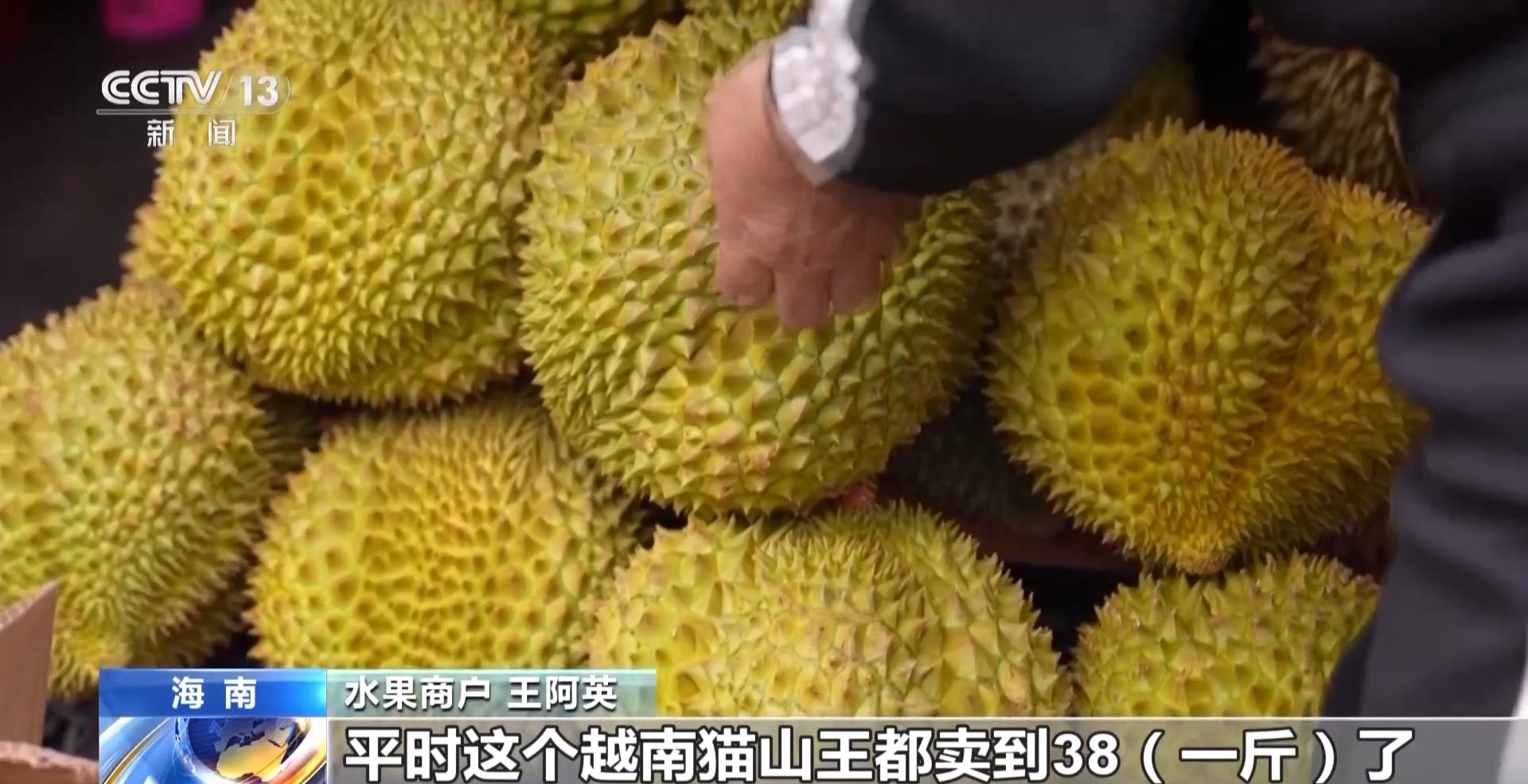 水果商户介绍,买榴莲的人比较多,榴莲都是很便宜的。平时这个越南猫山王都卖到38元/斤,现在卖到24.8元/斤,一天能卖100多箱,卖得都多。