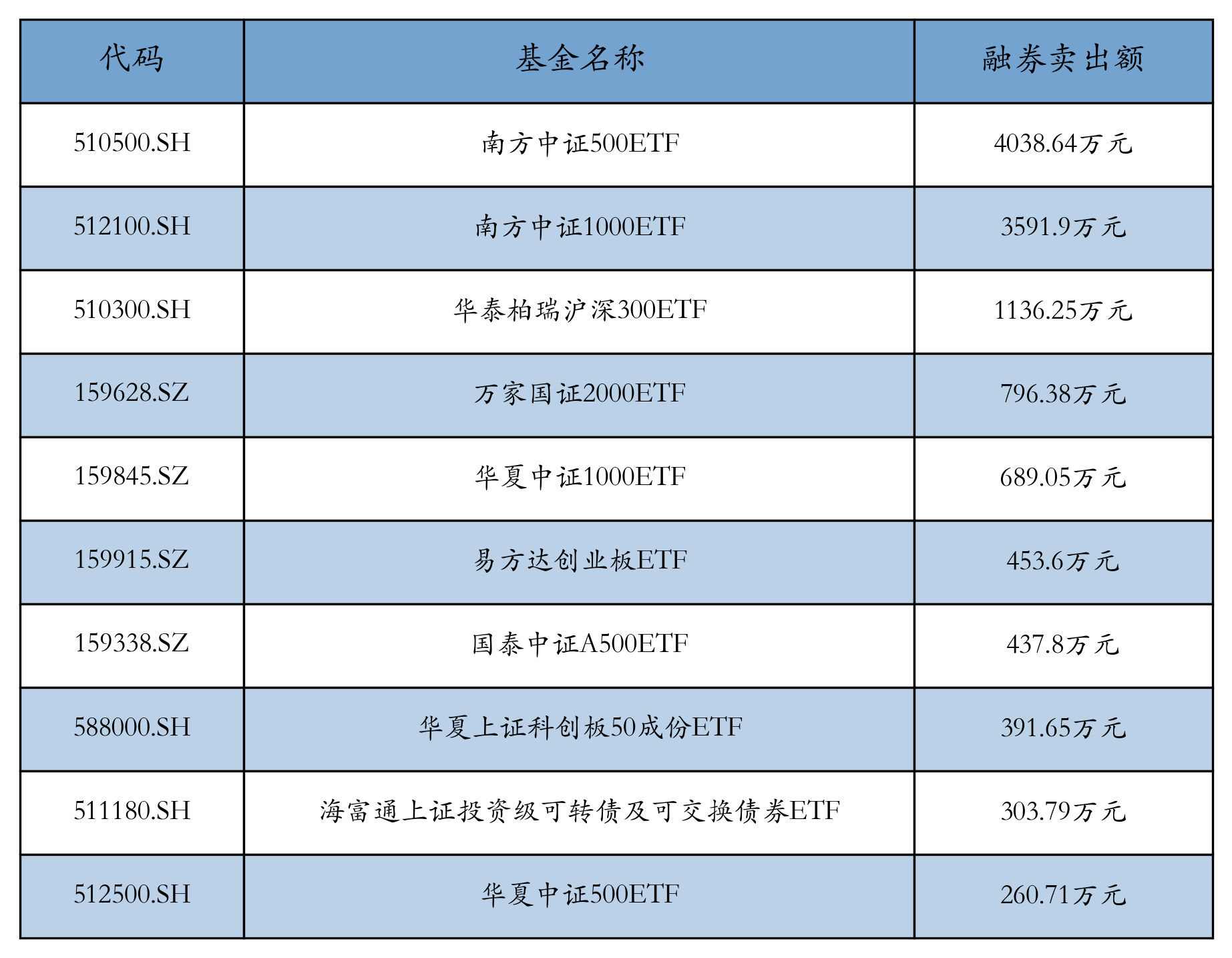 1月23日ETF融券卖出额前三位分别为:南方中证500ETF(4038.64万元)、南方中证1000ETF(3591.9万元)和华泰柏瑞沪深300ETF(1136.25万元),前10具体见下表: