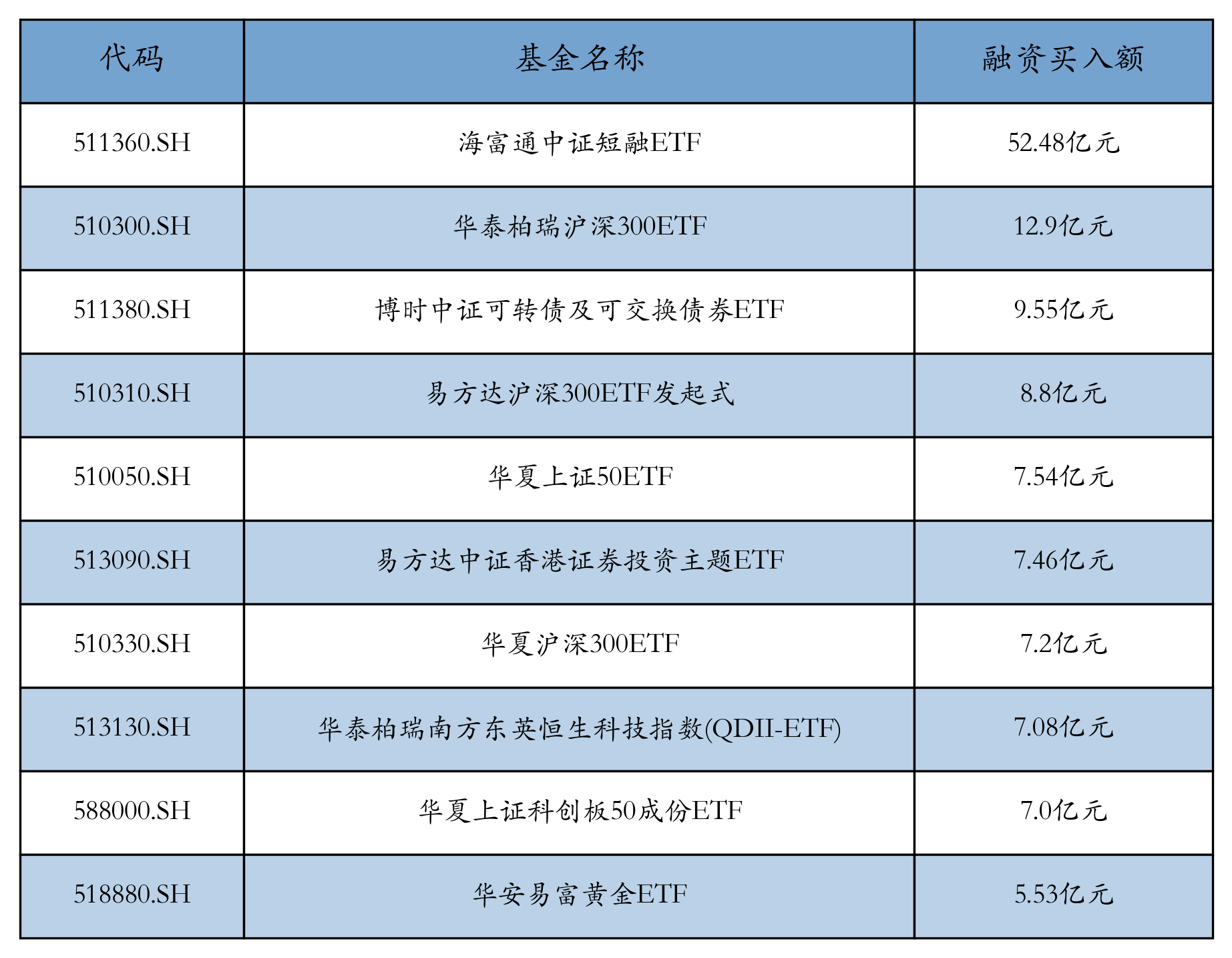1月23日ETF融资买入额前三位分别为:海富通中证短融ETF(52.48亿元)、华泰柏瑞沪深300ETF(12.9亿元)和博时中证可转债及可交换债券ETF(9.55亿元),前10具体见下表: