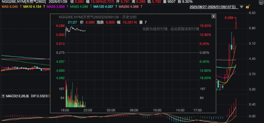 Wind行情数据显示,2月交割的美国天然气期货在26日的亚洲早盘一度涨超19%,最高触及每百万英热单位6.288美元。此前一周,该合约价格已累计上涨约70%,创下自1990年有记录以来的最大单周涨幅。