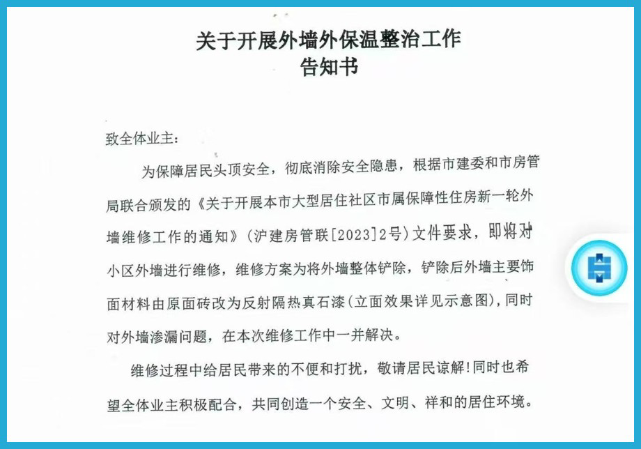 记者联系了结香居委会。工作人员表示,结香苑外墙使用的无机砂浆保温工艺存在一些安全隐患,导致外墙马赛克瓷砖存在脱落风险。为保障居民头顶安全,消除安全隐患,根据市建委和市房管局联合颁发的《关于开展本市大型居住社区市属保障性住房新一轮外墙外保温维修工作的通知》(沪建房管联[2023]2号)文件要求,对小区外墙进行维修,维修方案为,将外墙整体铲除,铲除后外墙主要饰面材料由原面砖改为反射隔热真石漆,同时对外墙渗漏问题,在本次维修工作中一并解决。当时结香苑尚未成立业委会,这一维修工程没有向居民进行签字征询。结香居委会管理的4个小区,都进行了类似外墙维修,均未向居民进行签字征询。“居民提到的曾有‘征询’,只是居民意见收集。”
