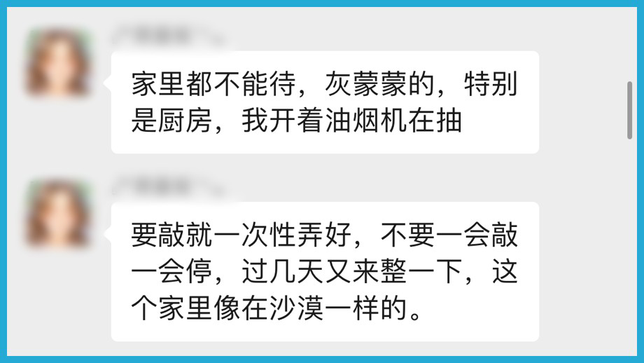 部分居民对外墙维修改造工程持排斥态度,背后亦折射出对施工单位不信任,认为其施工质量不过关,不靠谱。有人困惑:工人“瓷砖没铲掉直接糊水泥”,“瓷砖没铲掉就涂黄色隔水层”。还有人抱怨:“家里每天一层灰,一天拖地两遍。”“这个家里像在沙漠一样的。”“厨房灯都掉下来了。”甚至有居民质疑:“不是惠民工程吗,怎么搞成这副样子?”