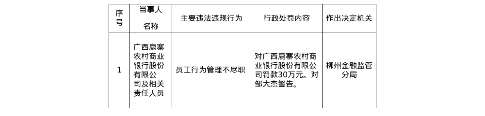 广西鹿寨农商行被罚30万,涉员工行为管理不尽职