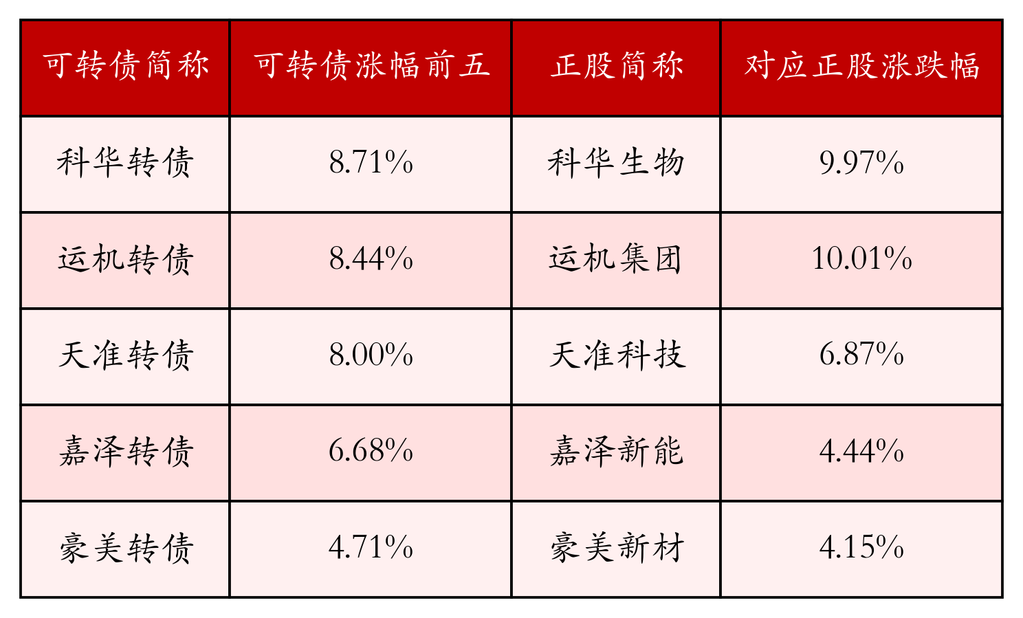 南财智讯1月26日电,盘后数据显示,债市方面,中证转债指数收跌1.19%,报528.14,成交额为927.91亿元。可转债方面,今日共成交374只可转债,其中44只收涨,0只收平,330只收跌。具体来看,13只可转债涨幅超过2%。其中科华转债(128124)涨8.71%,运机转债(127092)涨8.44%,天准转债(118062)涨8.0%。今日有112只可转债跌幅超2%,双良转债(110095)跌14.6%,福新转债(111012)跌8.98%,联创转债(128101)跌7.73%。存在交易量的可转债所对应的正股中,116只收涨,4只收平,254只收跌。具体来看,10只可转债对应正股涨幅超过5%,其中,瑞华泰(688323)涨停,收涨19.99%。同时所对应的可转债:瑞科转债(118018)同涨4.62%。今日有36只可转债对应正股跌幅超过5%,凯众股份(603037)跌停,收跌10.02%。同时所对应的可转债:凯众转债(113698)同跌7.53%;福新转债(111012)同跌8.98%。