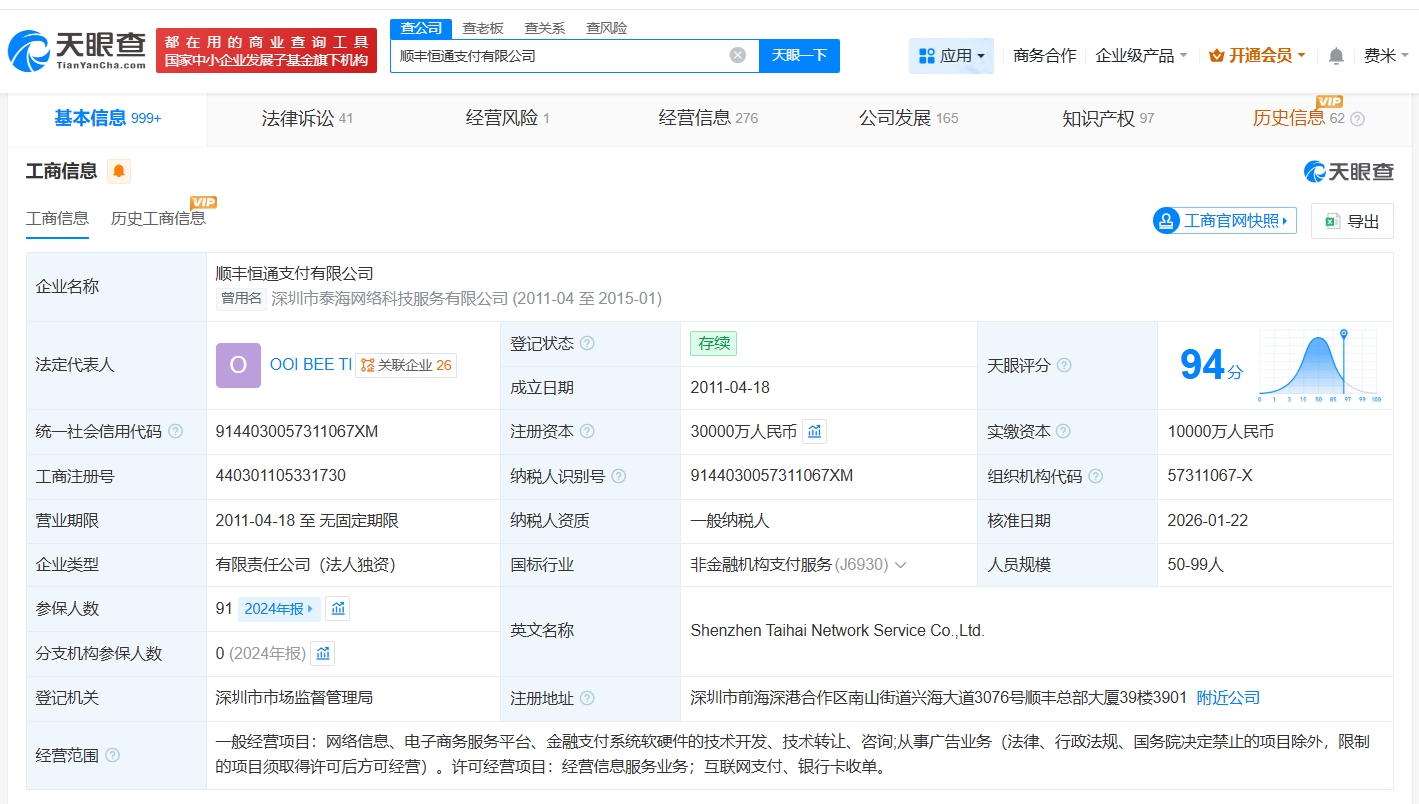每经AI快讯,天眼查工商信息显示,近日,顺丰恒通支付有限公司发生工商变更,注册资本由1亿元人民币增至3亿元人民币,增幅200%,同时,部分主要人员发生变更。顺丰恒通支付有限公司成立于2011年4月,法定代表人为OOIBEETI,经营范围包括网络信息、电子商务服务平台、金融支付系统软硬件的技术开发、技术转让、咨询等。股东信息显示,该公司由顺丰科技有限公司全资持股。