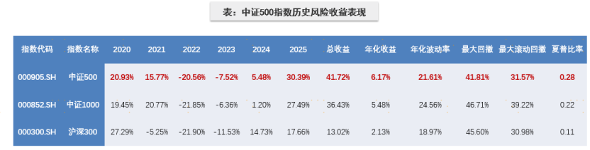 下图可以看出,如果把时间缩短到2020~2025年,中证500指数的夏普比率为0.28,明显高于沪深300的0.11和中证1000的0.22。这表明在承担同等风险的情况下,中证500指数能够获取更高的超额收益,性价比更高。