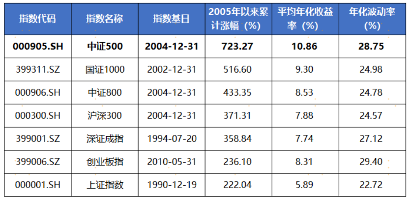 从指数的长期表现看,自2005年以来,中证500指数累计涨幅723.27%,年化收益超过10%,表现比同期的不少宽基指数更加突出。