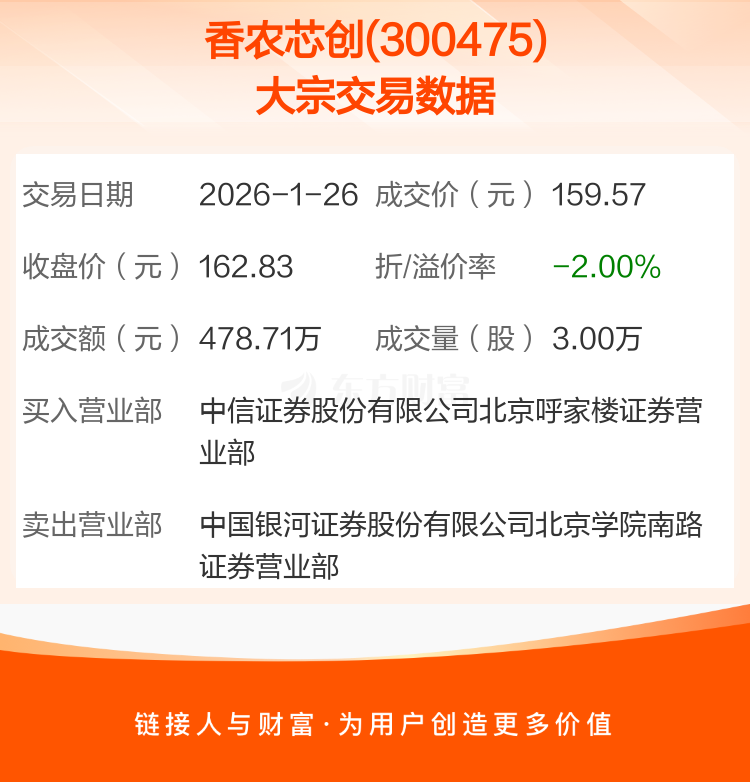 2026年1月26日,香农芯创发生1笔大宗交易,共成交3.00万股,成交金额478.71万元。