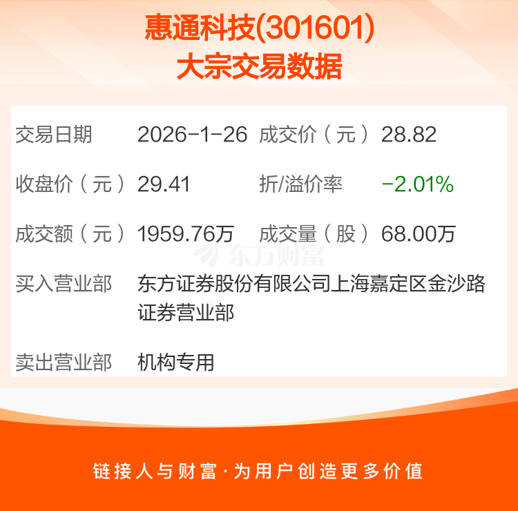 大宗交易:惠通科技成交1959.76万元,折价2.01%(1-26)