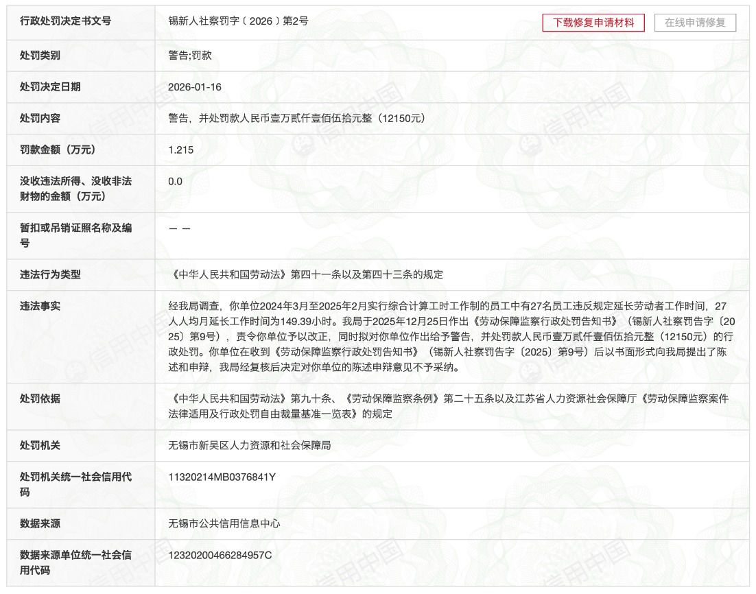 天眼查经营风险信息显示,近日,无锡当当网信息技术有限公司因违反劳动法相关规定,被无锡市新吴区人力资源和社会保障局处以警告,并罚款1.2万余元。处罚事由显示,该公司2024年3月至2025年2月实行综合计算工时工作制的员工中有27名员工违反规定延长劳动者工作时间,27人人均月延长工作时间为149.39小时。