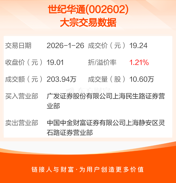 大宗交易:世纪华通成交203.94万元,溢价1.21%(1-26)