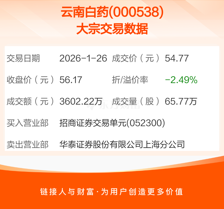 2026年1月26日,云南白药发生1笔大宗交易,共成交65.77万股,成交金额3602.22万元,占其流通市值比例为0.04%。