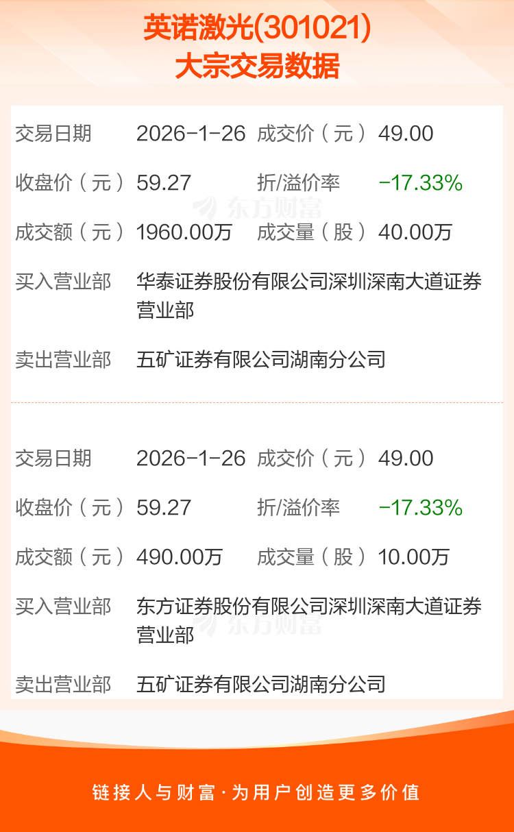 2026年1月26日,英诺激光发生2笔大宗交易,共成交50.00万股,成交金额2450.00万元,占其流通市值比例为0.27%。