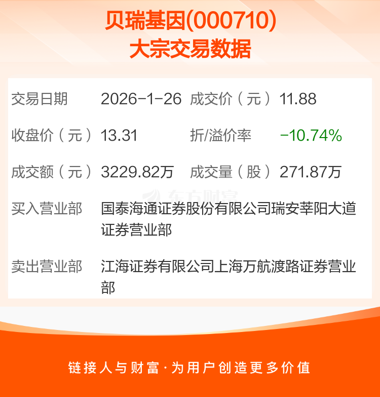 2026年1月26日,贝瑞基因发生1笔大宗交易,共成交271.87万股,成交金额3229.82万元,占其流通市值比例为0.74%。