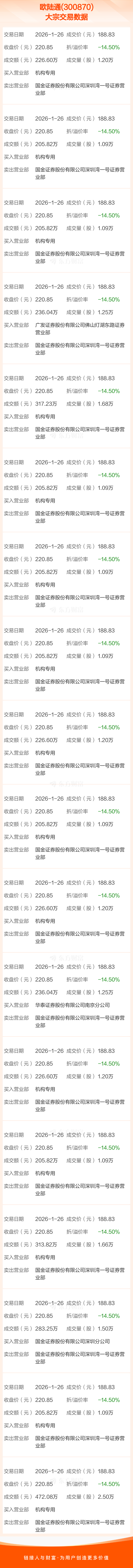 大宗交易:欧陆通成交4411.42万元,折价14.49%(1-26)