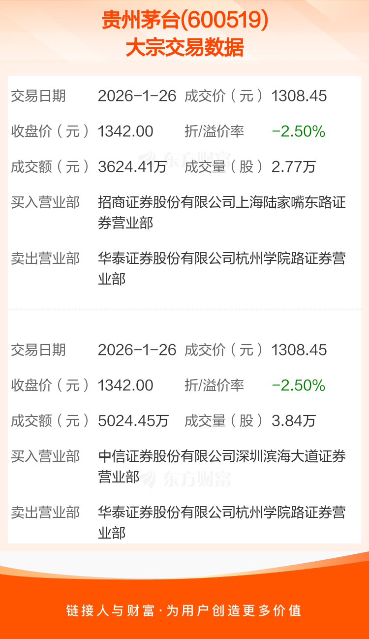 大宗交易:贵州茅台成交8648.86万元,折价2.50%(1-26)