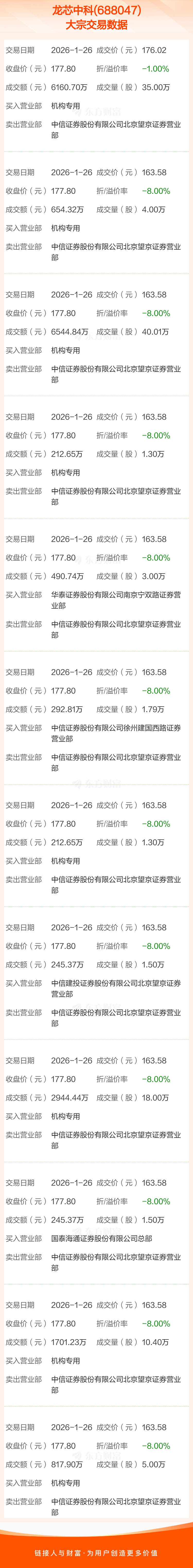 2026年1月26日,龙芯中科发生12笔大宗交易,共成交122.80万股,成交金额2.05亿元,占其流通市值比例为0.29%。