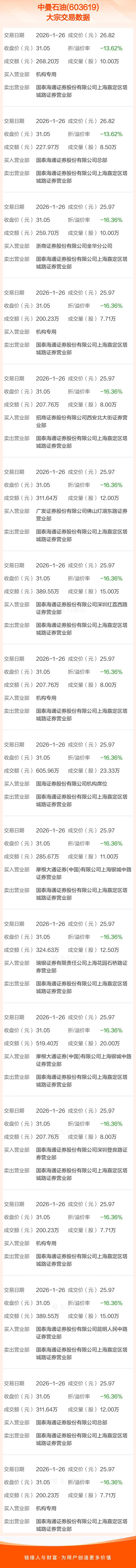 2026年1月26日,中曼石油发生17笔大宗交易,共成交196.46万股,成交金额5117.88万元,占其流通市值比例为0.36%。