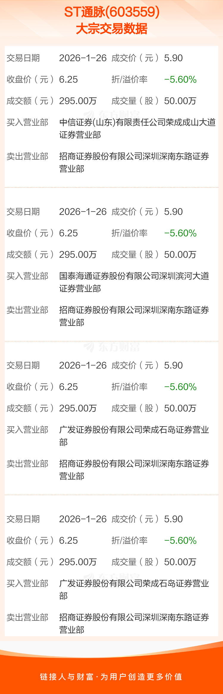 2026年1月26日,ST通脉发生4笔大宗交易,共成交200.00万股,成交金额1180.00万元,占其流通市值比例为0.47%。