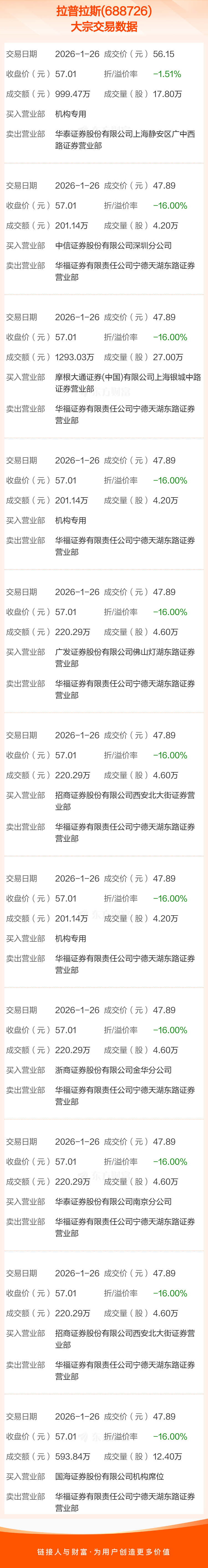 2026年1月26日,拉普拉斯发生11笔大宗交易,共成交92.80万股,成交金额4591.21万元,占其流通市值比例为0.37%。